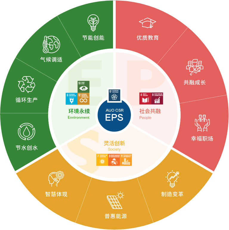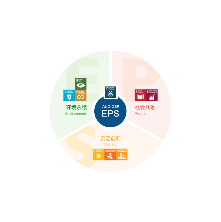 根据联合国所发展的17项永续发展目标,悟空体育光电以「超越企业社会责任,创造共享价值」为企业永续愿景发展蓝图,订出环境永续、共融成长与灵活创新的EPS(Environment, People & Society)三大永续发展主轴;以响应日益受关切的环境议题与社会共融趋势。